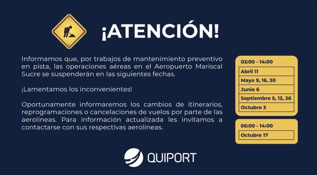 La planificación ha sido coordinada con la Dirección General de Aviación Civil (DGAC) y socializada con las aerolíneas, con el objetivo de reducir afectaciones en la operación aérea y permitir una adecuada reprogramación de itinerarios.